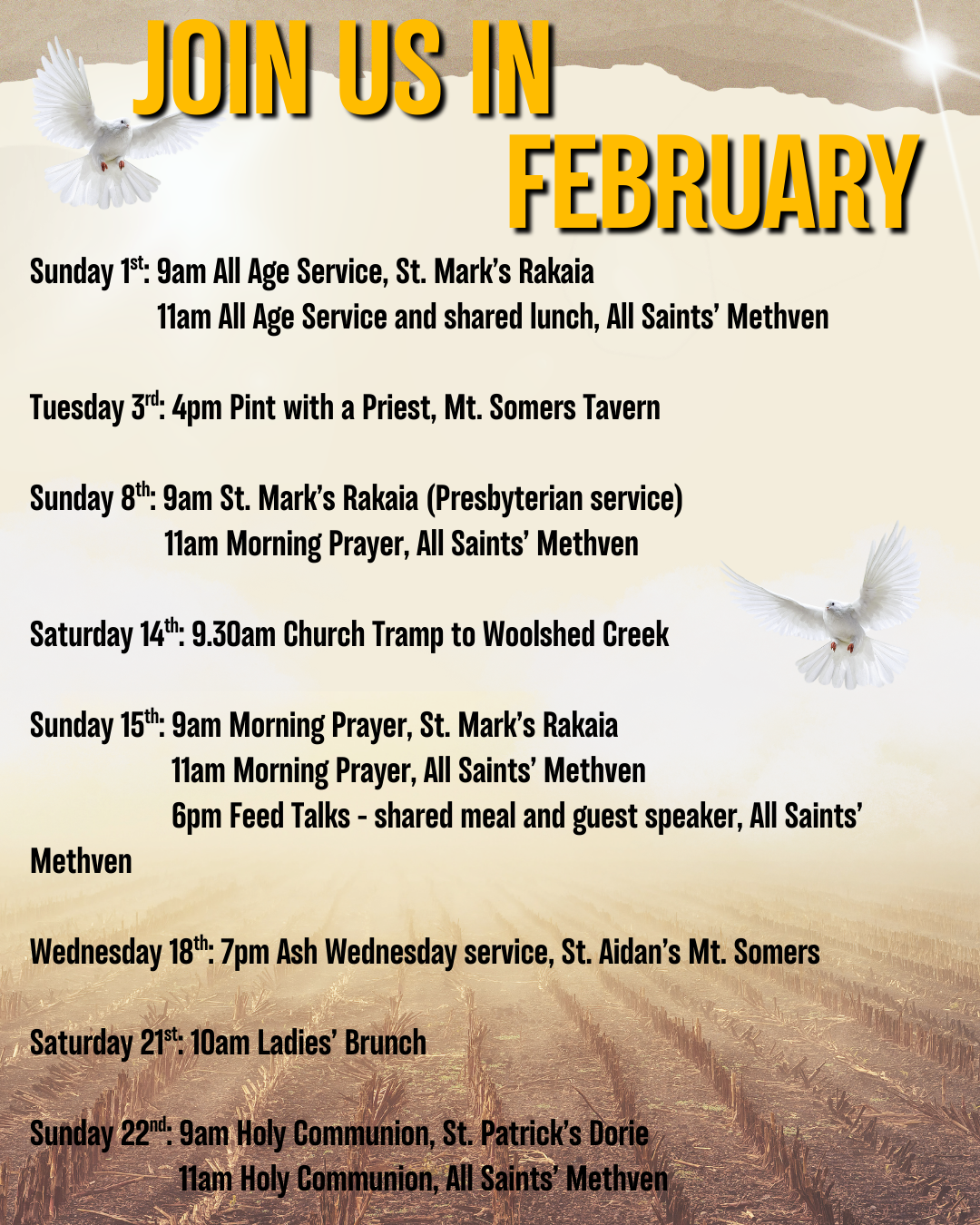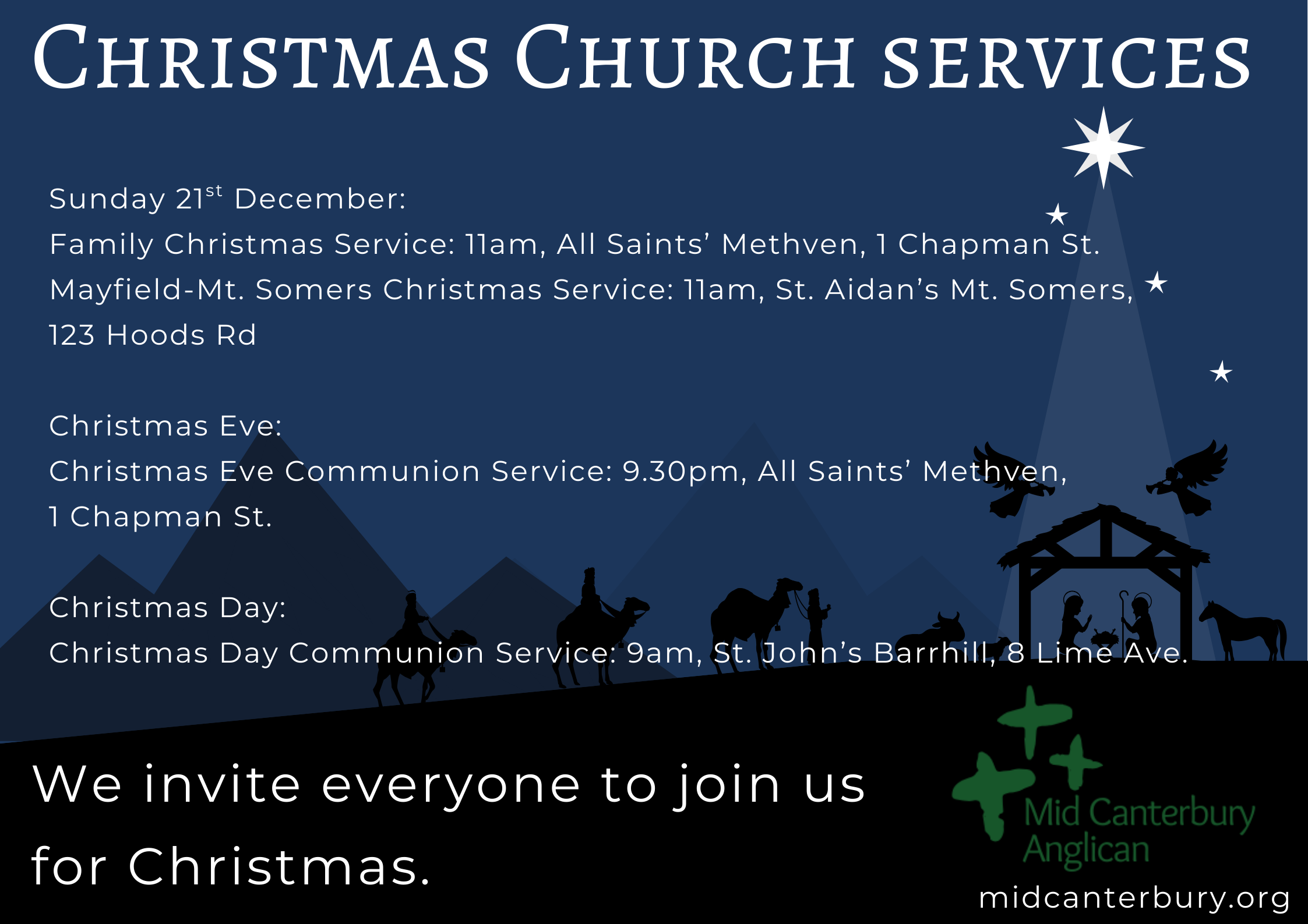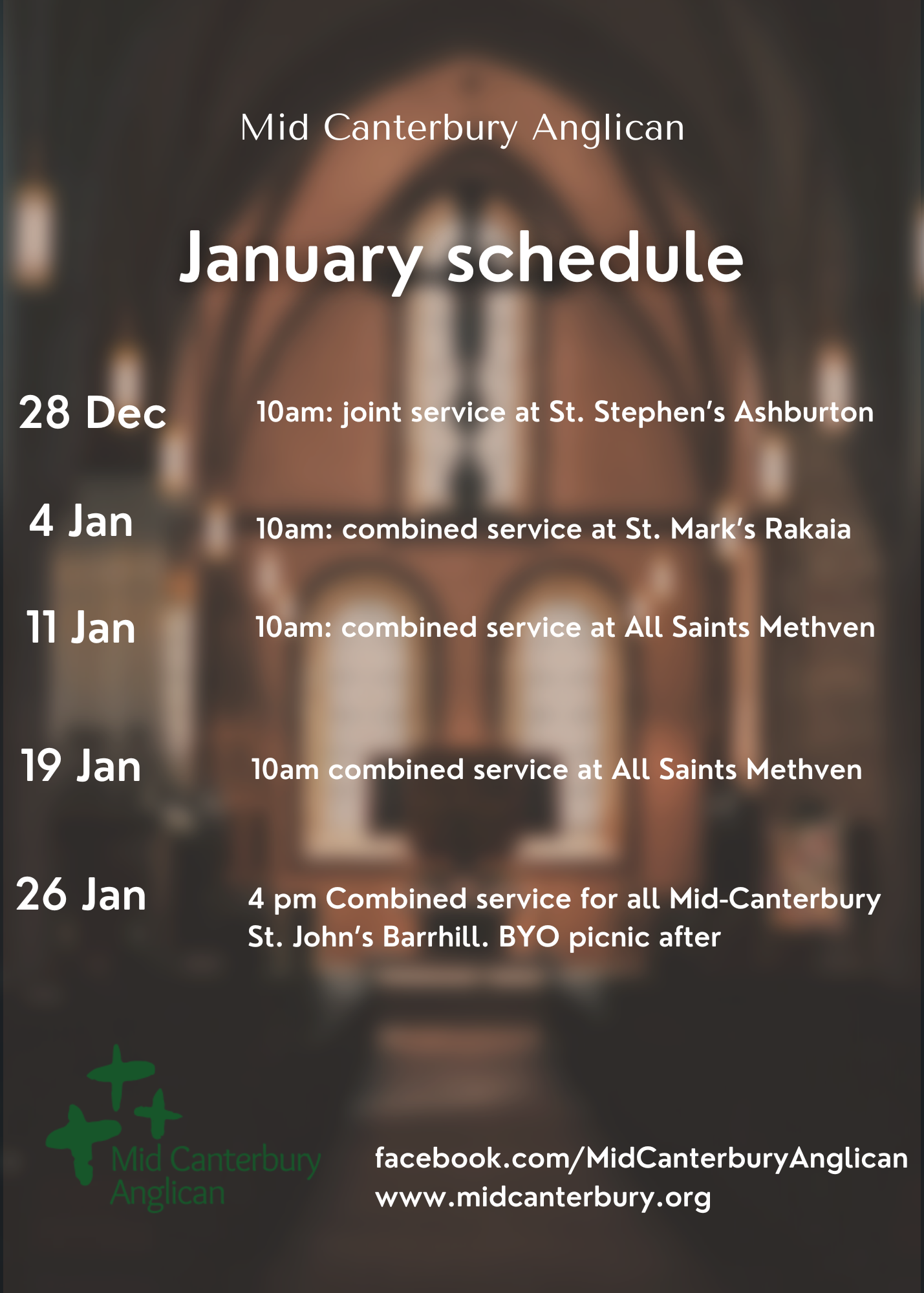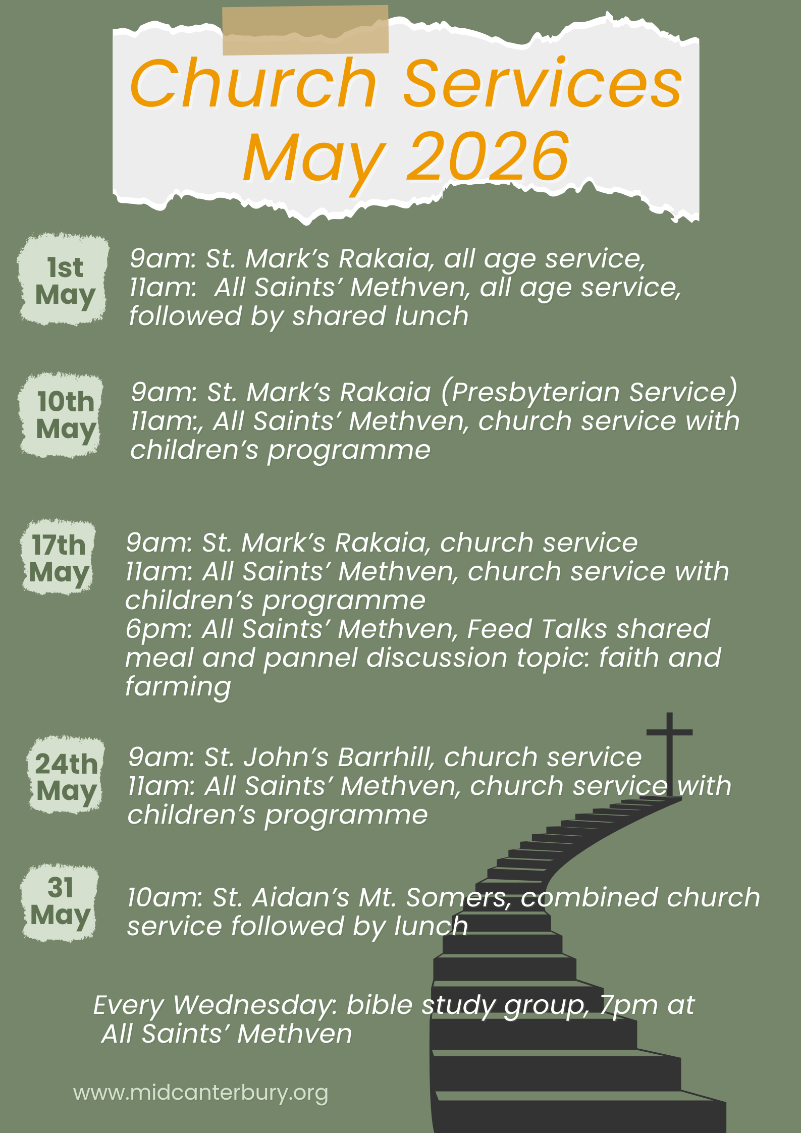 We are the rural parishes of mid-Canterbury: Methven, Rakaia and Mayfield-Mt Somers. We are a part of the Diocese of Christchurch in the Anglican Church in Aotearoa, New Zeland, and Polynesia. For other Anglican churches in the mid-Canterbury area, please check out the map below.